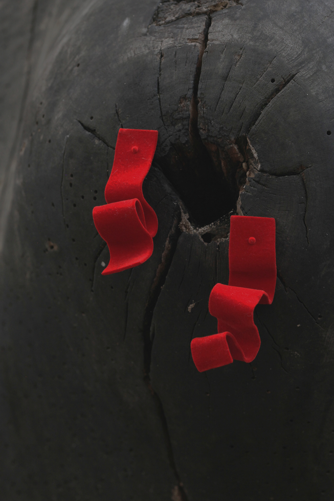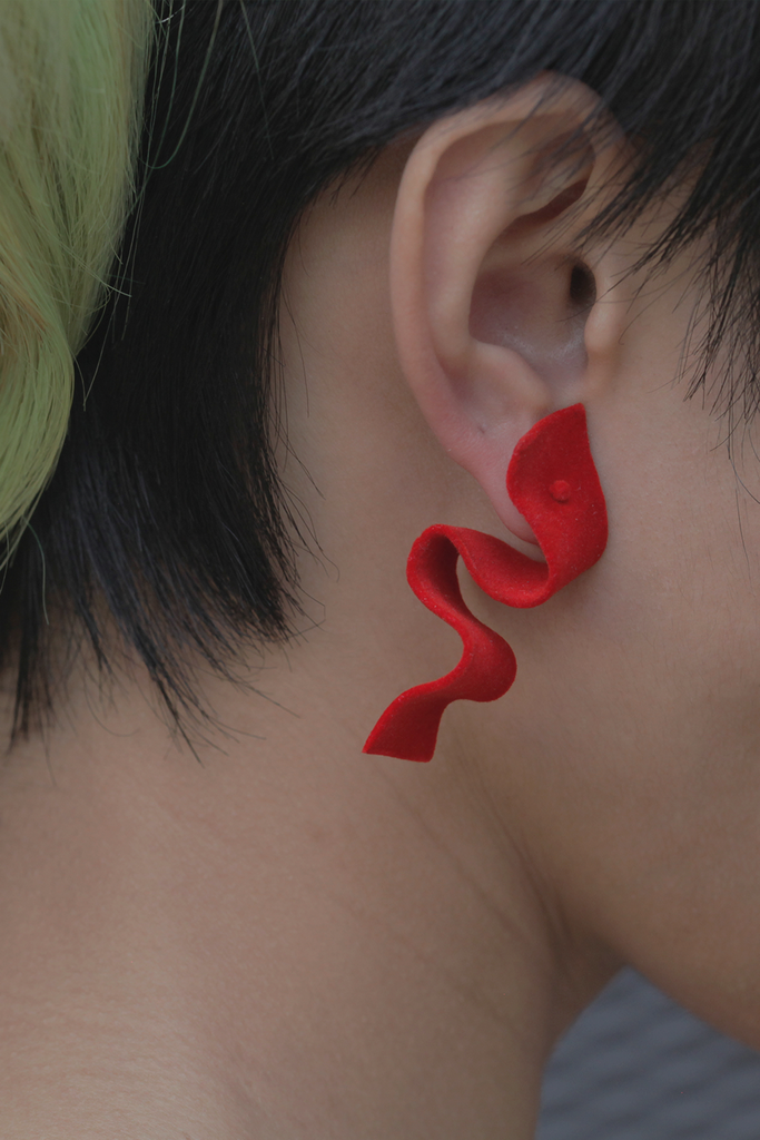 Earrings in thin slice of tin metal with velvet layer finishing. it could be bended and folded into various shapes.