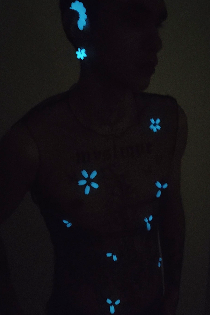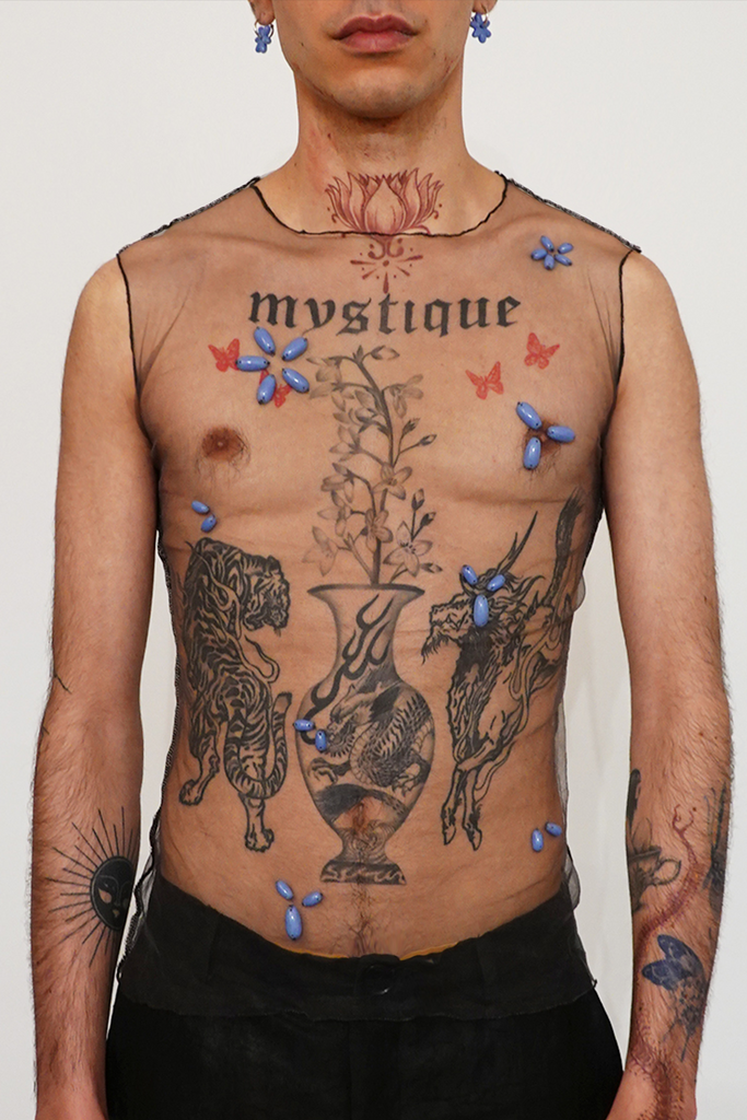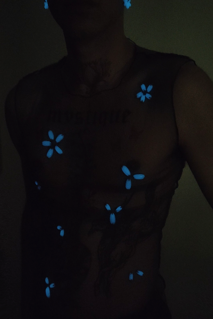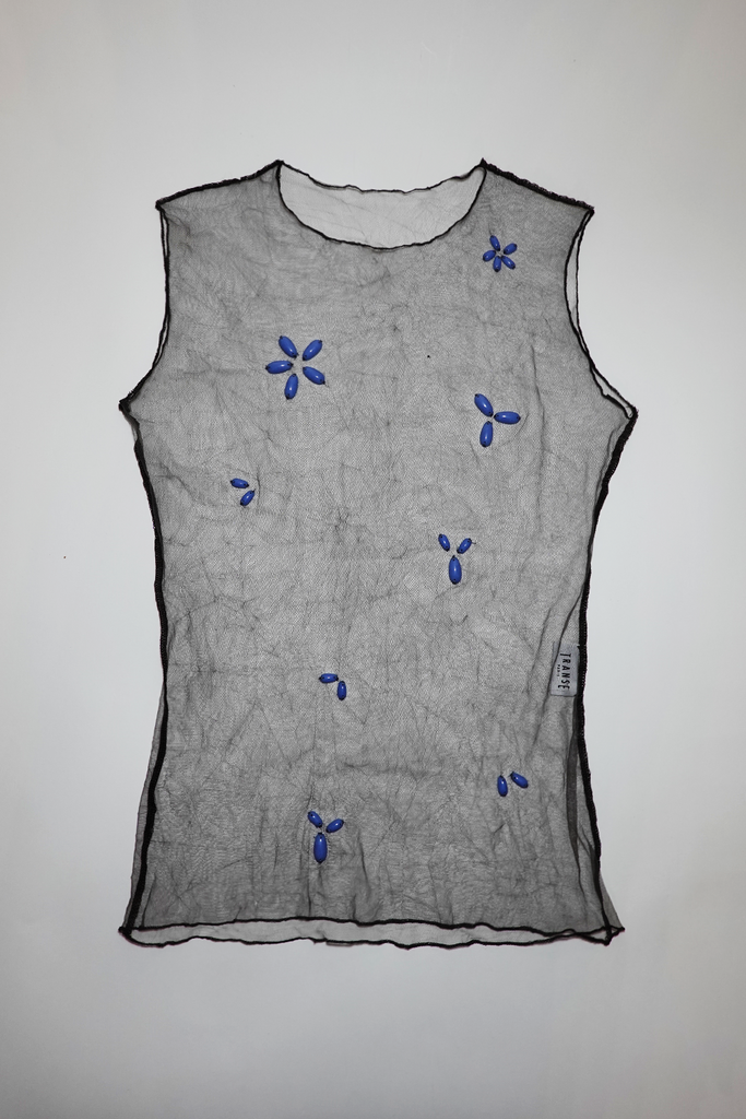 Grey transparent mesh top with details of flower-shaped luminous stone at the front