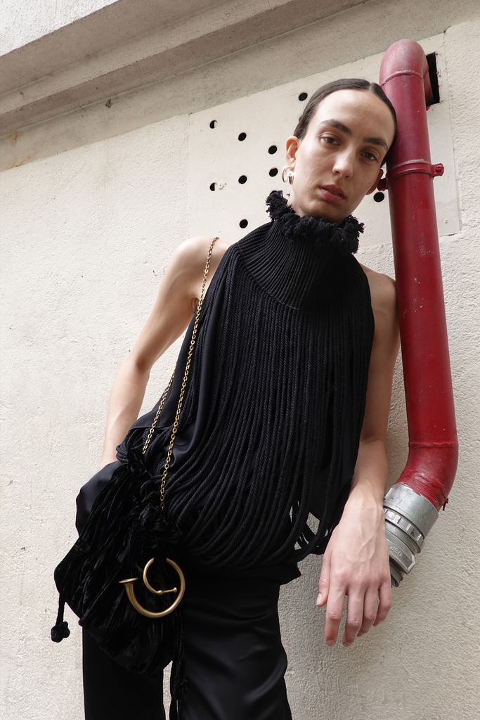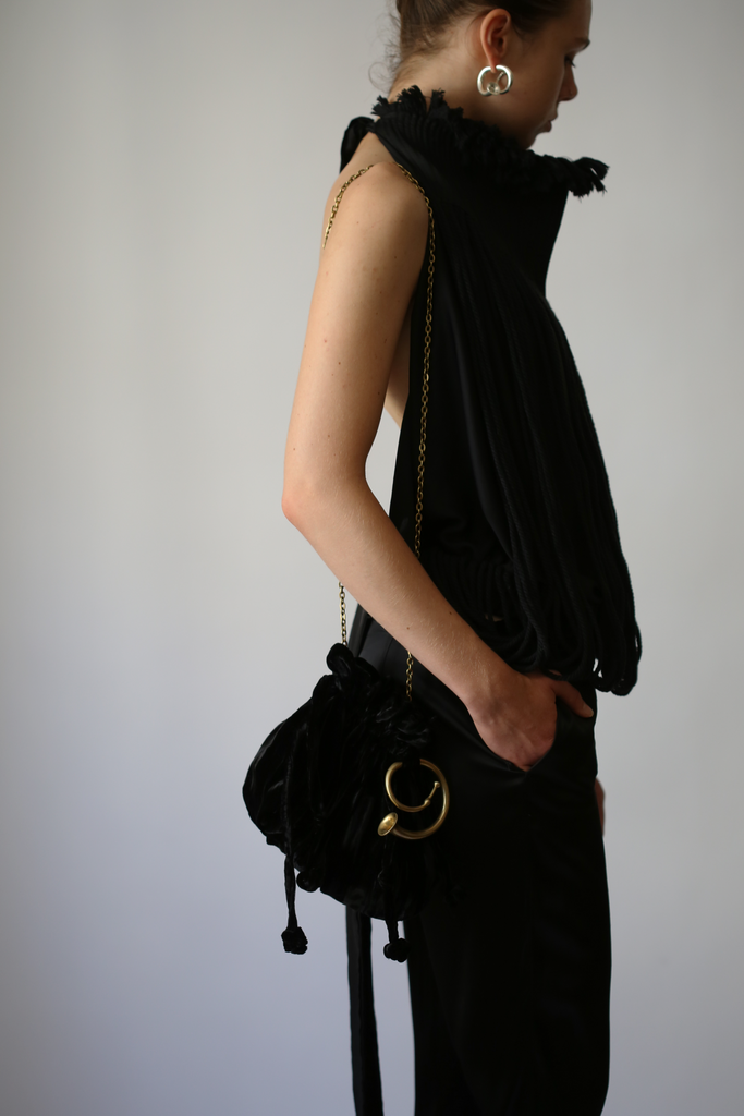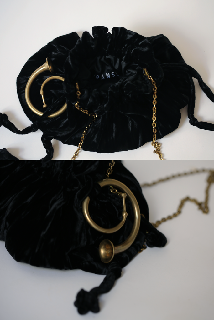Black pleated velvet bag adorned with an iconic ‘La Petite Trompette’ charm. It opens with drawstrings closure.