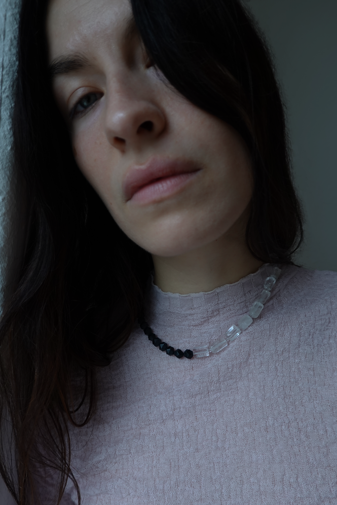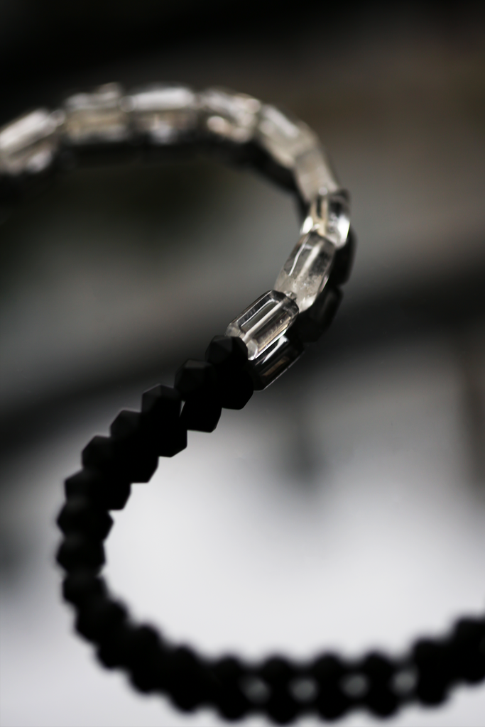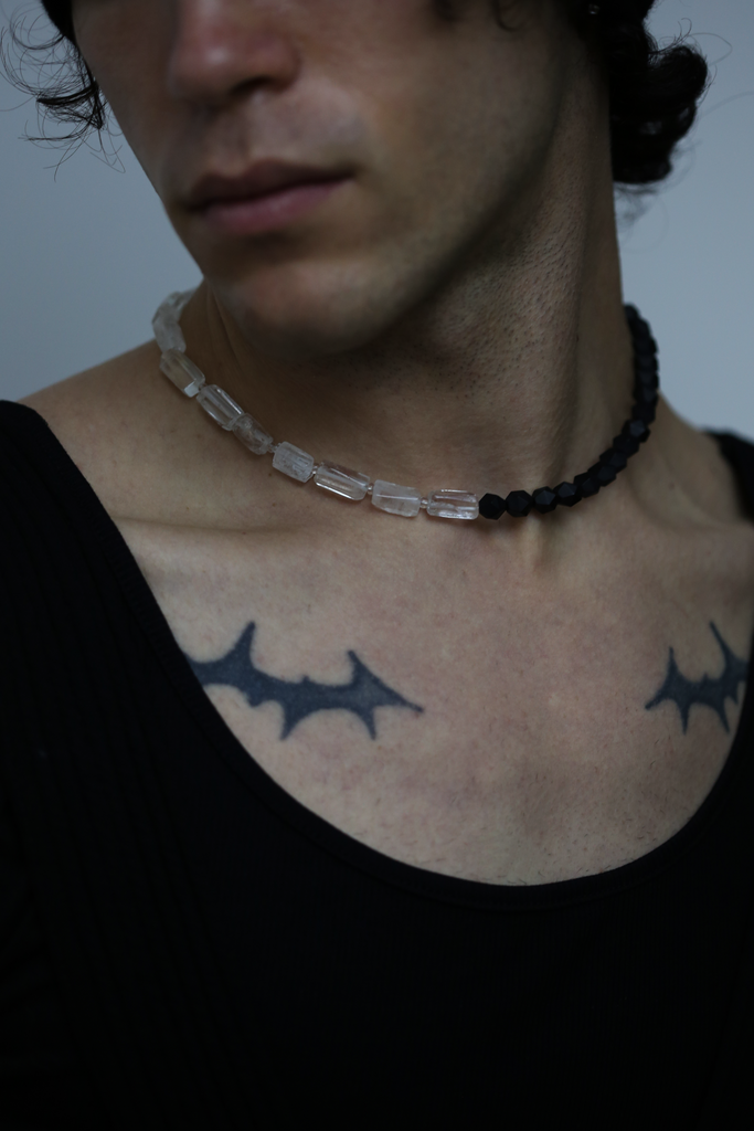 Necklace combining matte natural black onyx with rectangular clear quartz.