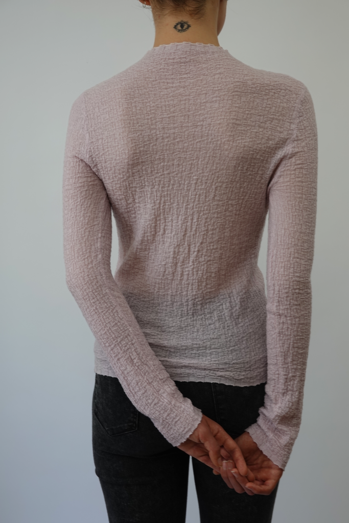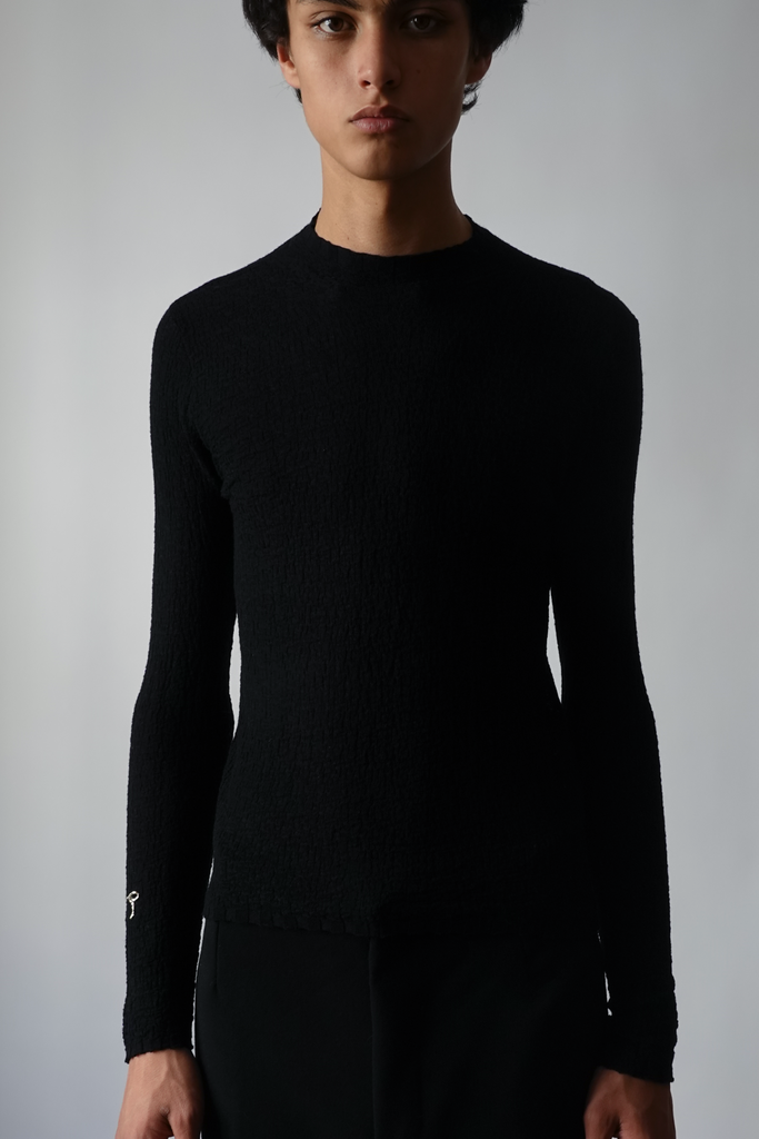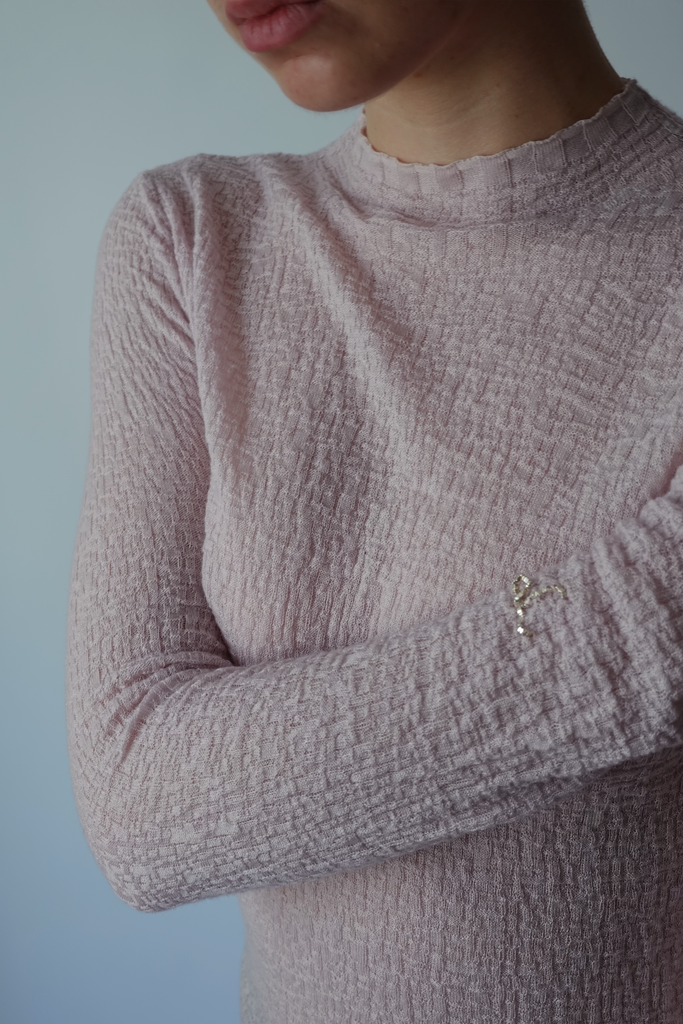 Pullover in light-weight fine wool with a texture of grain-like finish, embellished with a subtle hand-stitched logo in pure tiny silver stones on the arm.