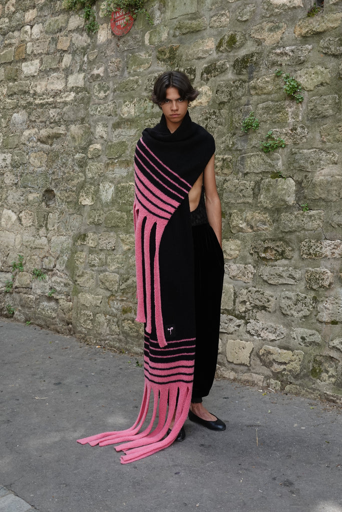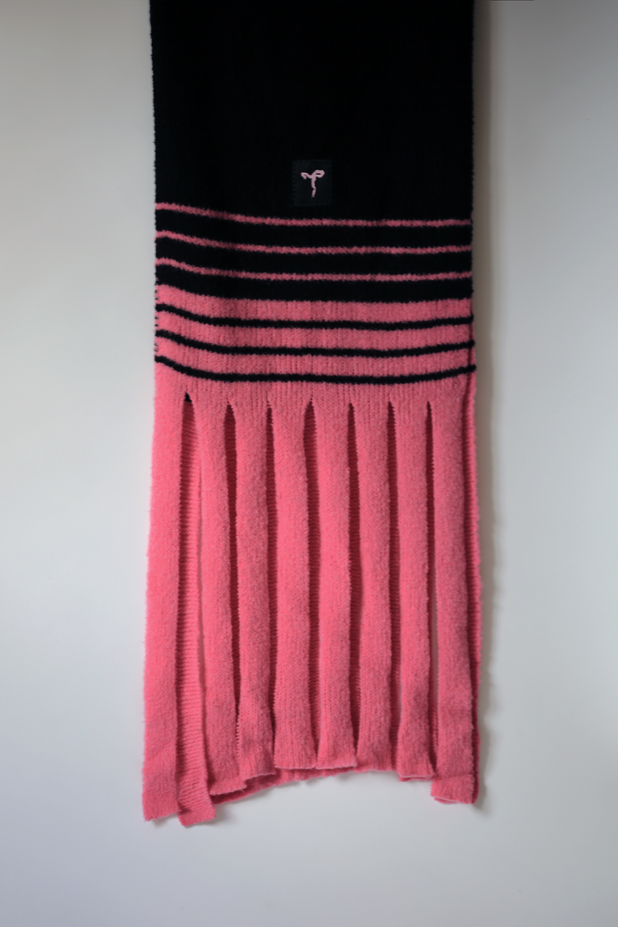 A mixture blend of wool and cotton giving a soft touch, with pink stripes and extra long and wide fringes on each side.