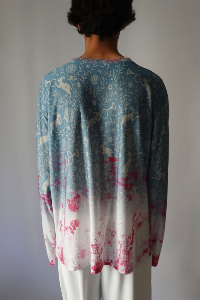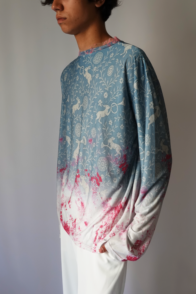 Relaxed long sleeve t-shirt featuring  the unique all-over ‘Lapinette’ print, finished with lace details around the neckline.